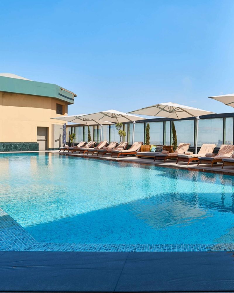 تقع منطقة المسبح والمطعم على قمة الطابق الخامس والعشرين من فيرمونت نايل سيتي (Fairmont Nile City)، حيث تكشف لك عن بانوراما خلابة للقاهرة. استمتع بالنظر إلى أفق المدينة المميز، حيث تقف الأهرامات المهيبة كحراس خالدين في المسافة البعيدة. وعلى مسافة أقرب، ينعطف نهر النيل الأسطوري برشاقة، مما يضيف إلى المشهد الآسر.