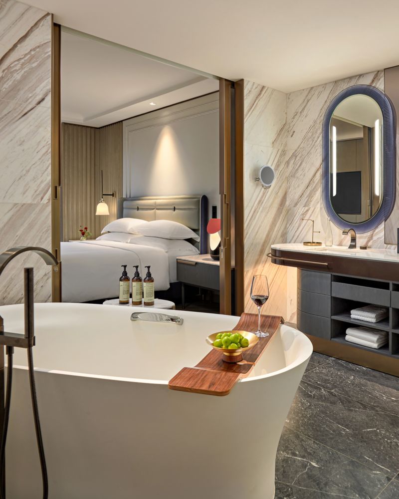 اطّلع على الأسعار اطّلع على التفاصيلEnjoy a private balcony, plush king bed, and marble bathroom with separate shower and bathtub. Indulge in Le Labo amenities, Nespresso coffee, a Marshall speaker, and 65-inch TV. Accessible and connecting rooms on request.