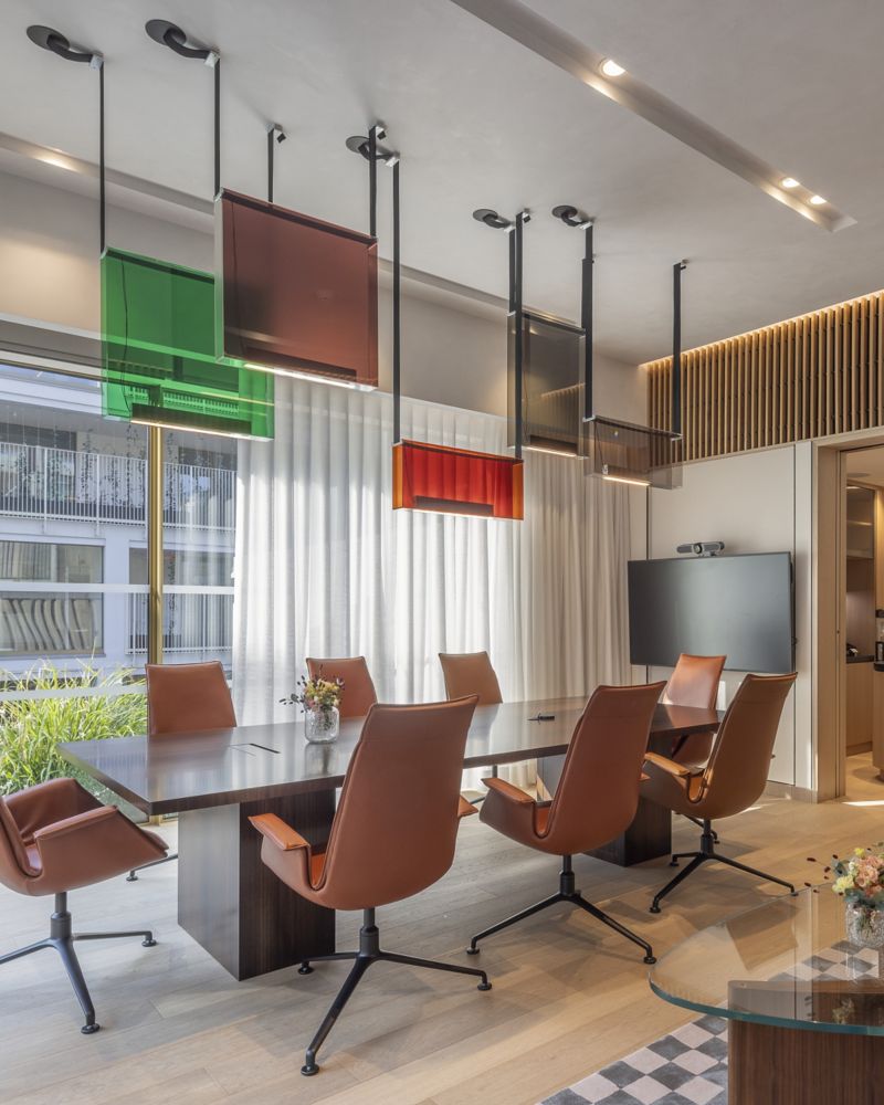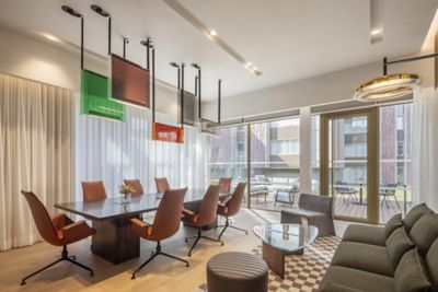 Premium suite with stunning views overlooking the city and the Vltava River. The space is elegantly appointed, characterized by sleek furniture and sophisticated modern design that draws on the building's unmistakable architectural signatures.