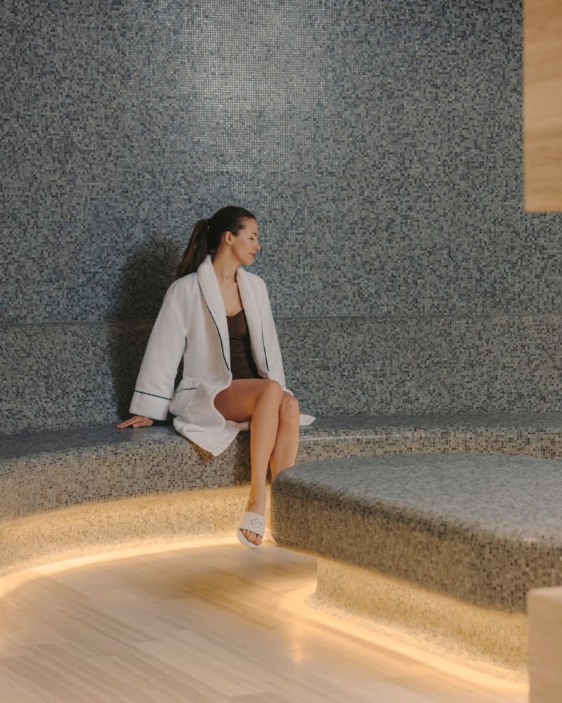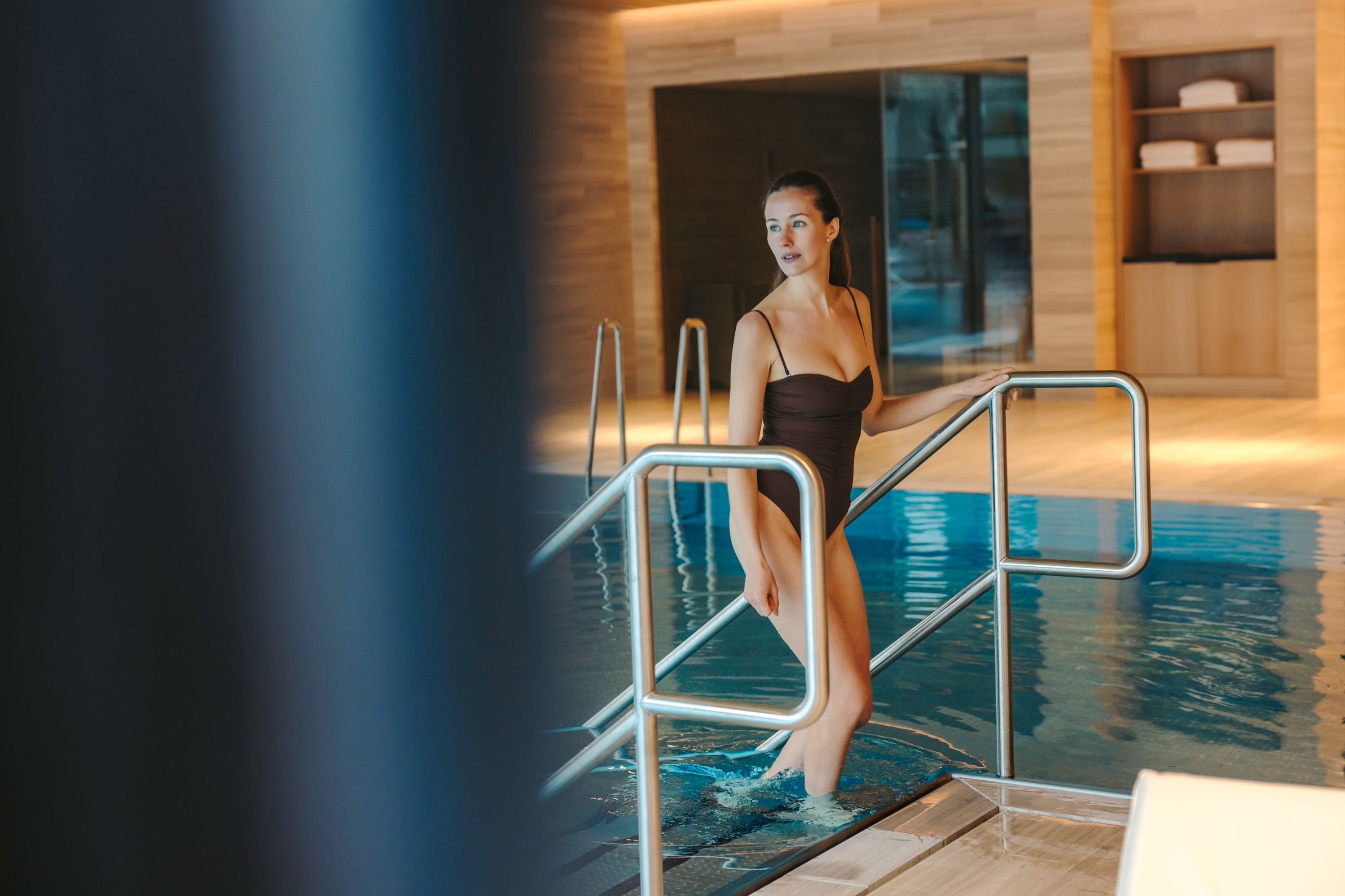 The hotel spa invites guests to unwind in a luxurious heated L-shaped pool, seamlessly connecting indoor and outdoor spaces to bring the beauty of nature within reach, no matter the season.