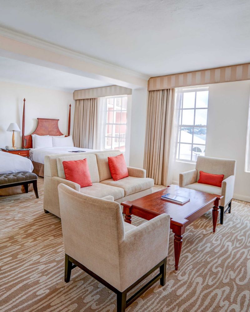 Geräumiges Zimmer im historischen Hauptgebäude. Elegante Innenraumgestaltung, inspiriert von der Schönheit von Bermuda. Die Ausblicke variieren. 12 USD Trinkgeld pro Person und Tag, zahlbar beim Check-out.