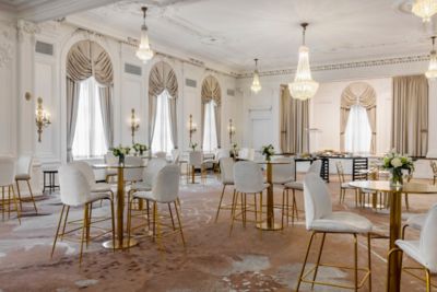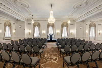 Our largest space, the Crystal Ballroom is adorned with thirteen crystal chandeliers that sparkle from the ornately gilded ceiling, accentuated in gold and blue. The stately marble columns and distinctive architectural details of the Crystal Ballroom foyer provide an elegant welcome to your guests.