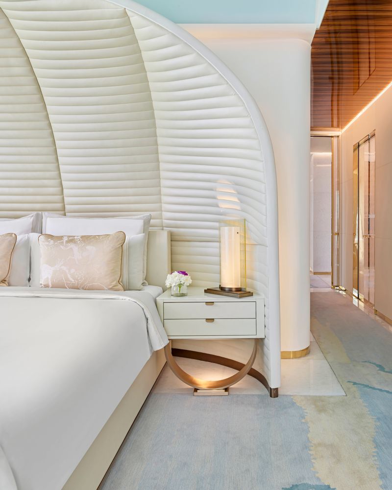 Die palastartige Presidential-Suite, die sich über zwei Etagen des Fairmont Doha erstreckt, verkörpert das arabische Flair. Dieses Refugium verfügt über 3 opulente Schlafzimmer, eine Show-Küche, ein Kino, ein privates Fitnessstudio und ein Tauchbecken.