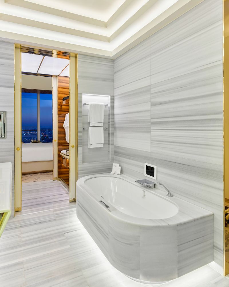 Themen-Suite mit Designelementen des kulturellen Erbes von Doha und Panoramablick auf die Küste. Opulentes Schlafzimmer mit einem Doppelbett, Wohn- und Esszimmer. Begehbarer Kleiderschrank und Badezimmer mit frei stehender Badewanne und separater Dusche.