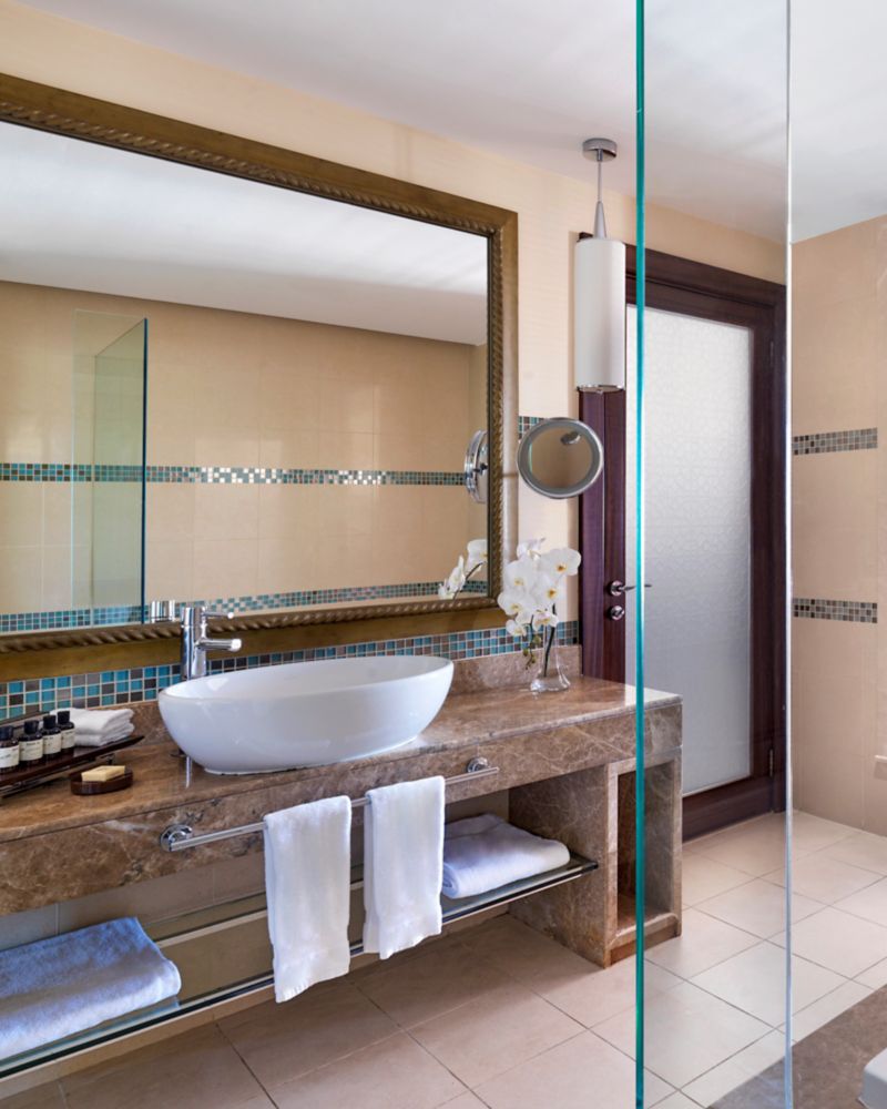 Die Präsidenten-Suite im orientalischen Stil steht für echten Luxus und bietet große Wohnbereiche, Marmor-Badezimmer, einen begehbaren Kleiderschrank, separaten Essbereich und eigene Terrasse mit Whirlpool und Panoramablick auf den Persischen Golf.