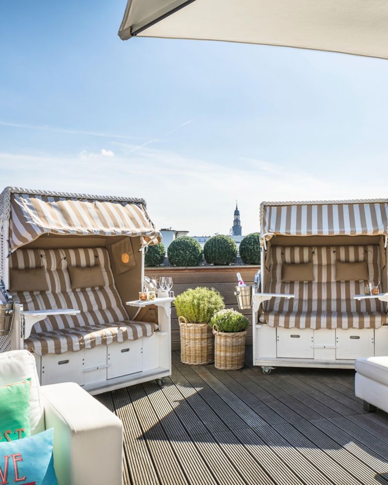 In den Sommermonaten können Sie sich auf unserer sonnigen Dachterrasse auf Luxus pur freuen. Erfreuen Sie sich auf unserer exklusiven Terrasse über den Dächern von Hamburg an der fantastischen Aussicht und genießen Sie ein leichtes Mittagessen oder ein erfrischendes Getränk auf unseren luxuriösen Sonnenliegen.