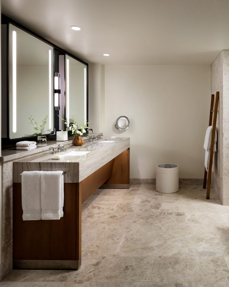 Feiern Sie den direkten Meerblick von der großzügigen, möblierten Privatterrasse. Die geräumige Suite mit einem Schlafzimmer soll das reiche kulturelle Erbe von Maui erinnern. Luxuriöses Badezimmer mit Badewanne, begehbarer Dusche und Doppelwaschbecken.
