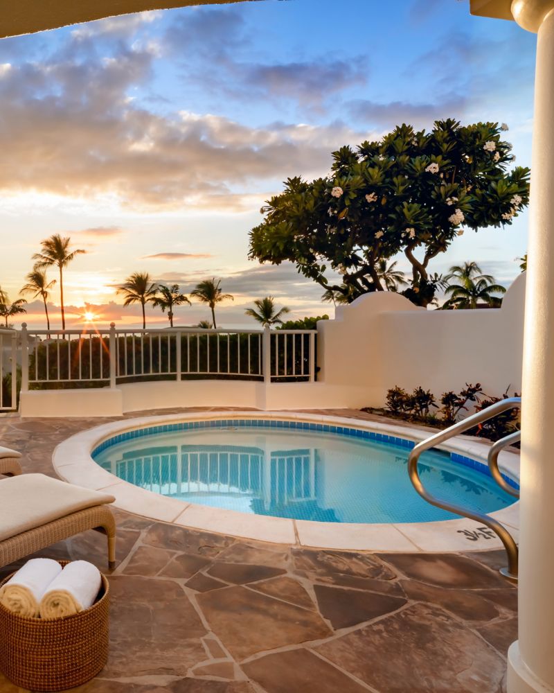 Feiern Sie den direkten Meerblick von der großzügigen, möblierten Privatterrasse. Die geräumige Suite mit einem Schlafzimmer soll das reiche kulturelle Erbe von Maui erinnern. Luxuriöses Badezimmer mit Badewanne, begehbarer Dusche und Doppelwaschbecken.