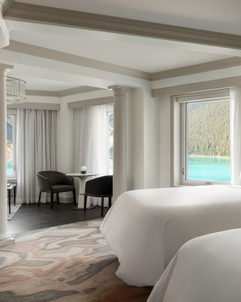 Private Lounge mit Concierge-Service und Frühstück & Kanapees. Zimmer mit 2 Queensize-Betten und herrlichem Blick auf den Lake Louise und Victoria-Gletscher. 34 m².