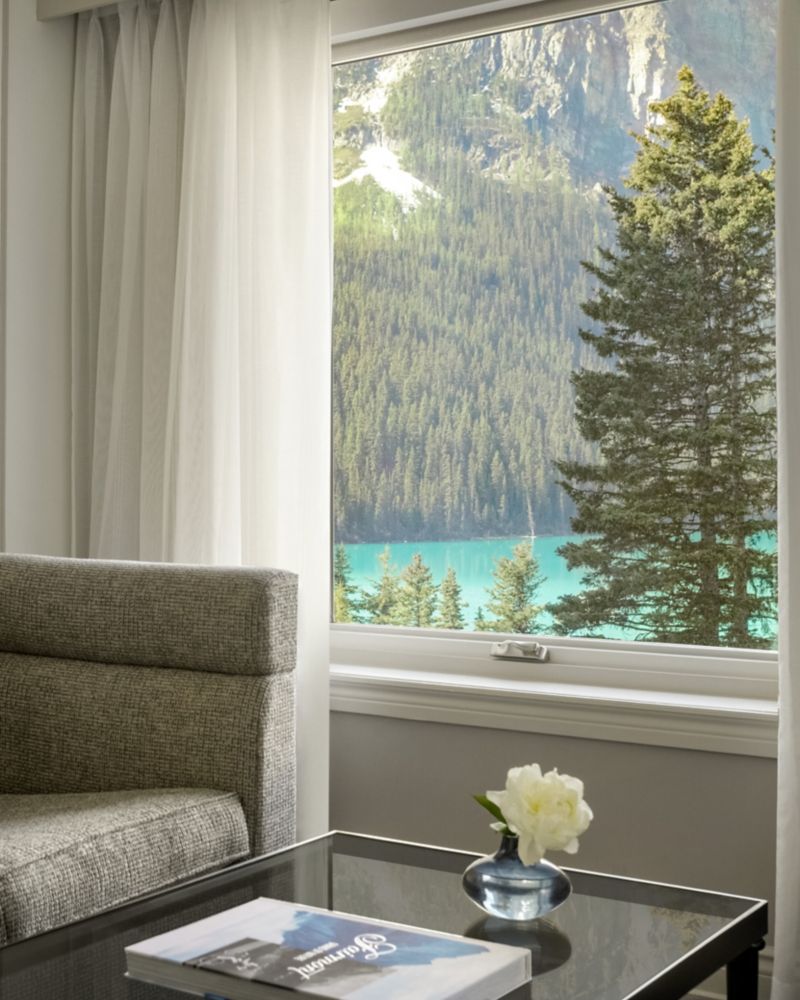 Signature-Suite der Kategorie Fairmont Gold mit spektakulärem Blick auf den Lake Louise und Victoria-Gletscher. Deckenhohe Fenster. Geräumiges Wohnzimmer. 1 Kingsize-Bett, 1,5 Badezimmer. 69 m².