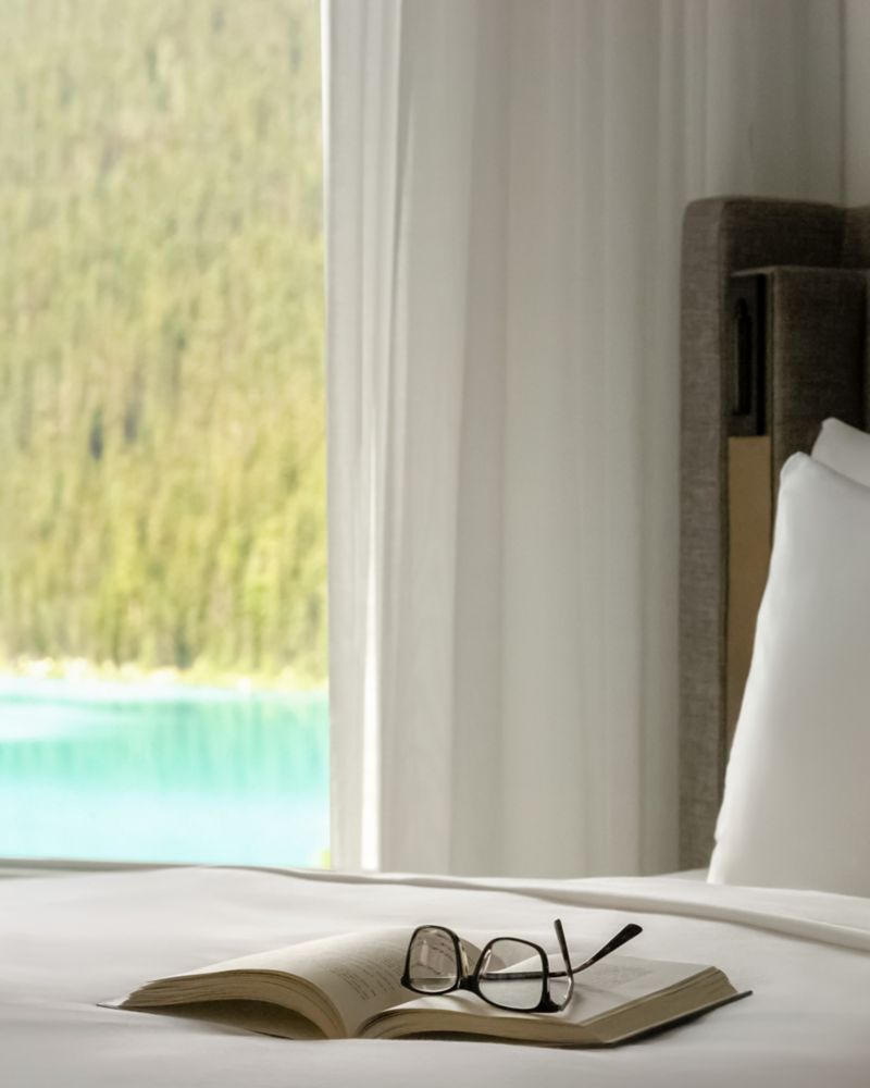 Private Lounge mit Concierge-Service und Frühstück & Kanapees. Offenes Raumkonzept mit 1 Kingsize-Bett. Spektakulärer Blick auf den Lake Louise und Victoria-Gletscher. 44 m².