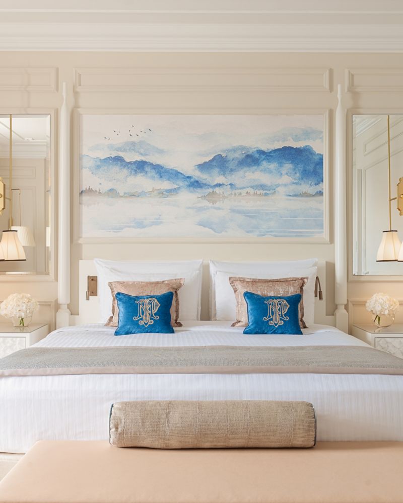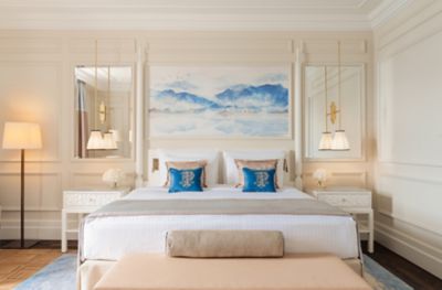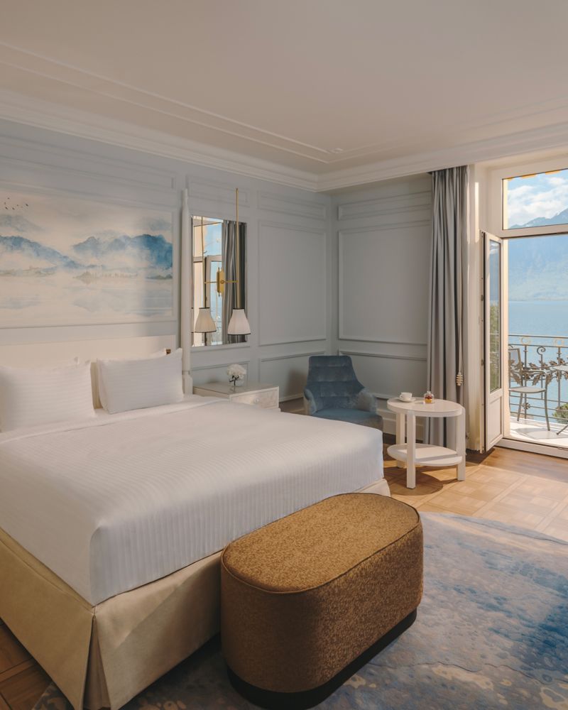 The Junior Lake View Suite is a luxurious open-concept room with an elegant design, where you can admire the amazing view on Lake Geneva and the Alps from the large balcony, offering a King or Twin bed, a sofa bed, and luxury amenities.
