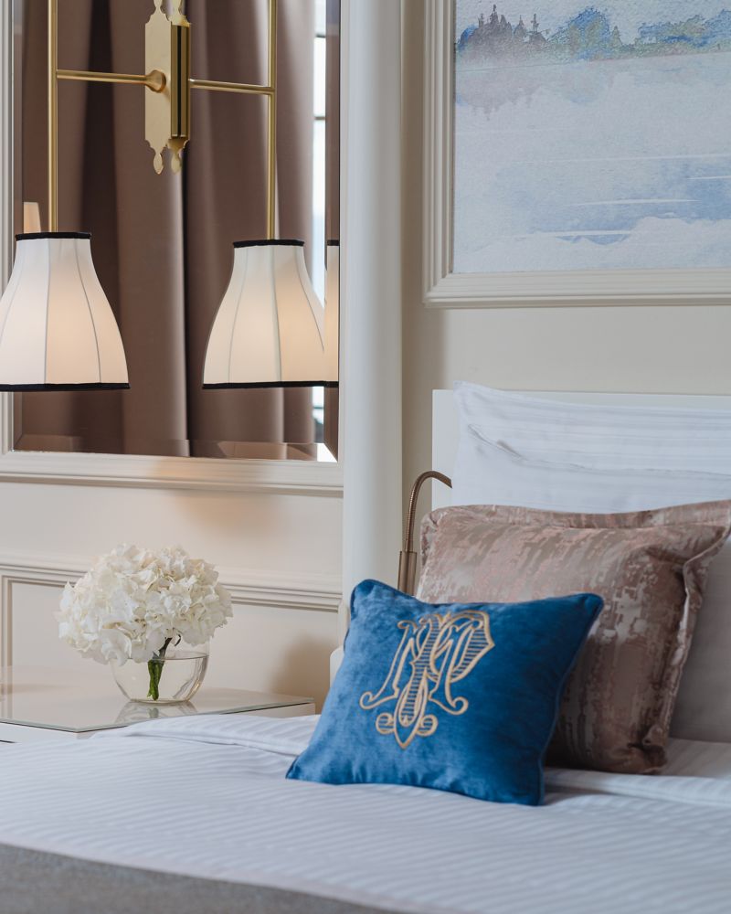 The Bellevue suites feature spacious bedroom with oversized bed, modern furniture, in-suite iPad directory and adjacent bathroom entirely marbled.