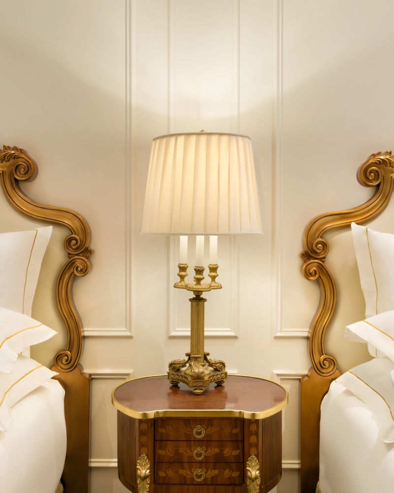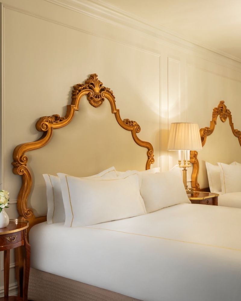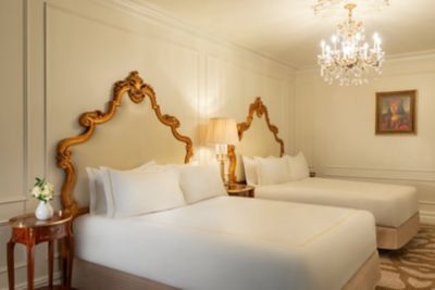For those seeking more spacious accommodations, Deluxe Two Queens deliver 550 sq. ft. of living space with double Queen beds, two comfortable armchairs, and a meticulously crafted writing desk. The bathroom is finished with inlaid "earth stone" mosaics and includes a luxury shower and separate WC. Among many splendid details include24-carat gold-plated Sherle Wagner fixtures, as well as solid white marble vanities.