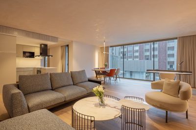 Schlafzimmer mit Kingsize-Bett, das in einem modernen, luxuriösen Stil eingerichtet ist, mit geräumigem Wohnzimmer, voll ausgestatteter Küche, Hauptbadezimmer und zusätzlichem Gäste-WC mit Pflegeprodukten von Le Labo. Einige mit privatem Balkon.