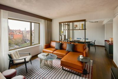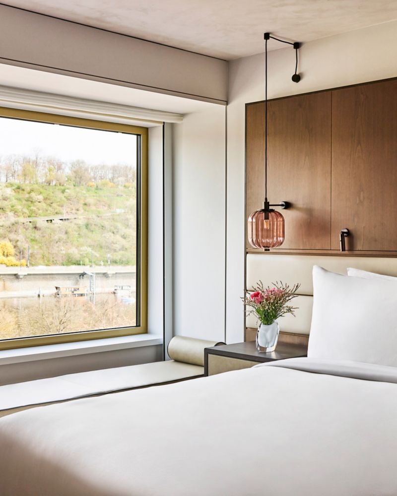 Premium-Suite mit atemberaubendem Blick auf die Stadt und die Moldau. Der Raum ist elegant eingerichtet und zeichnet sich durch ein raffiniertes modernes Design aus, das die unverwechselbare Architektur des Gebäudes aufgreift.