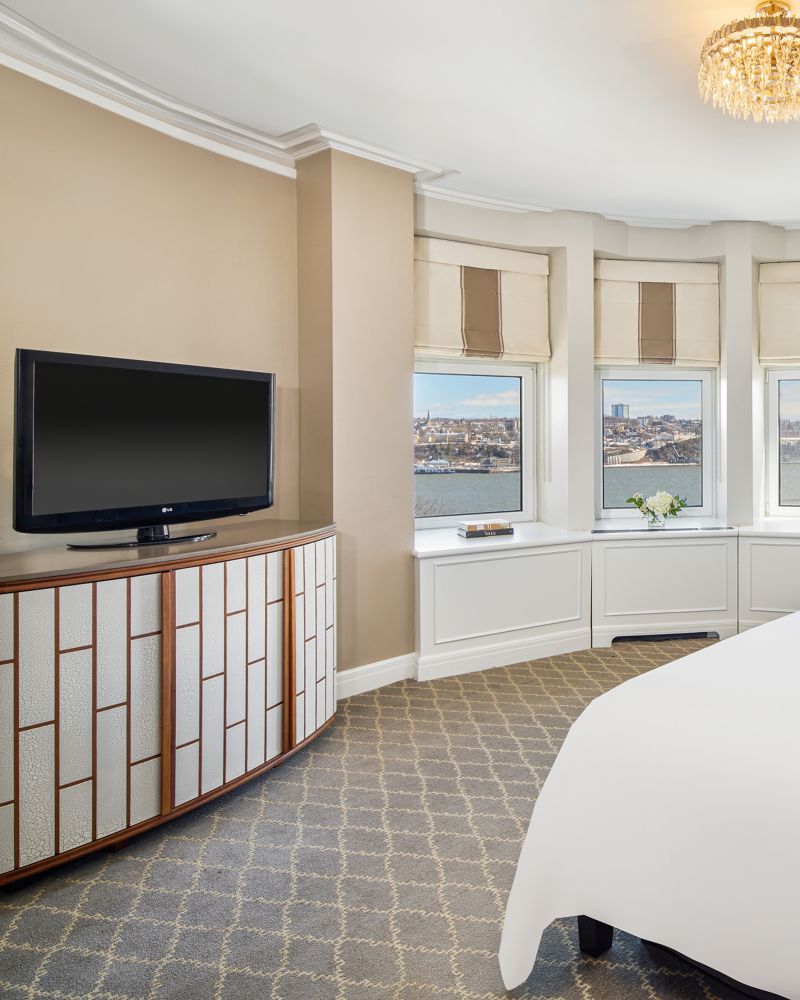 Premium-Suite, im Elizabeth II-Dekor, luxuriöses Schlaferlebnis, Marmorbadewanne, geräumiges Wohnzimmer, Blick auf den St. Lorenz-Strom.