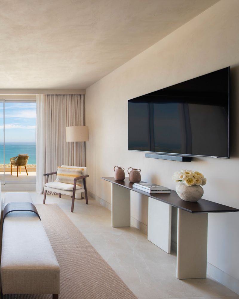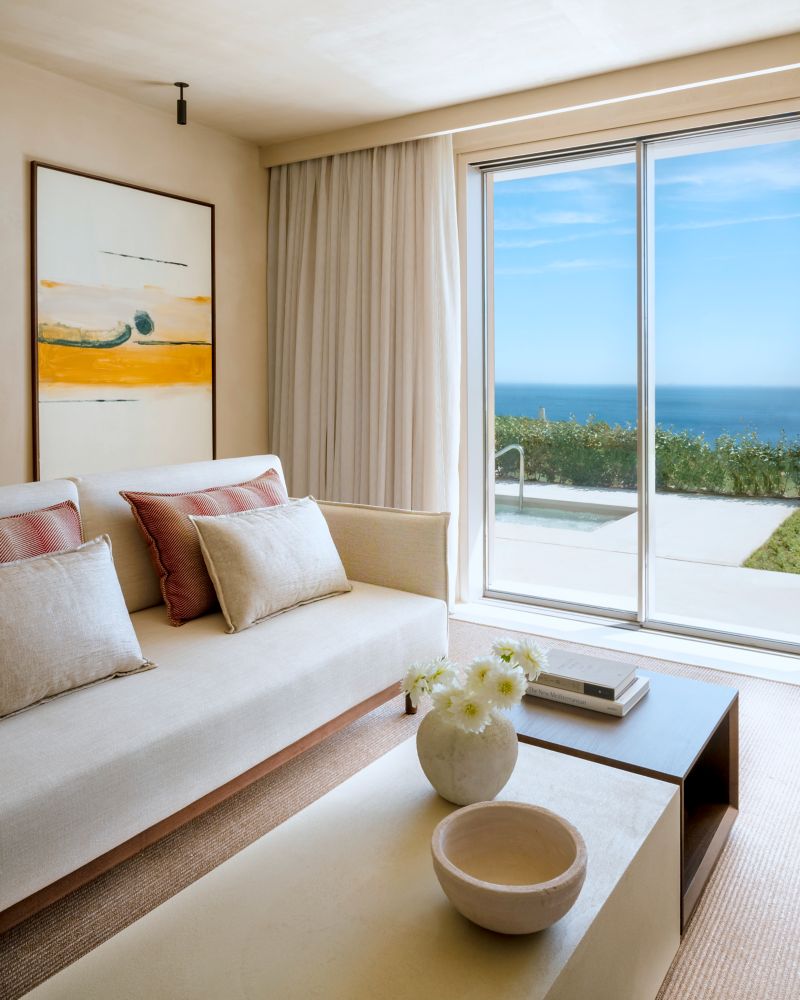 Elegante und geräumige mediterrane Einrichtung mit einer dezenten Kombination aus Möbeln aus natürlichen Materialien. Zimmer mit 1 Kingsize-Bett, integrierter Lounge, Marmor-Badezimmer und erfrischender Terrasse mit Blick auf den einladenden Pool.