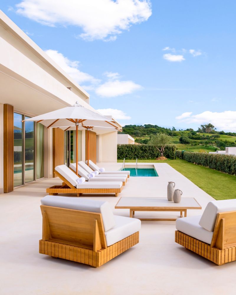 Elegante und geräumige mediterrane Einrichtung mit einer dezenten Kombination aus Möbeln aus natürlichen Materialien. Zimmer mit 2 Queensize-Betten, integrierter Lounge, Marmor-Badezimmer und erfrischender Terrasse mit Blick auf den einladenden Pool.