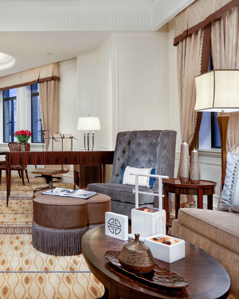 Room 719, the suite is approximately 178 sq m in size, with a spacious living room, dining room, bedroom and bathroom. The Chinese Suite is resplendent in design, colour and decorative detail, with an Imperial dragon design on the scarlet ceiling, complem