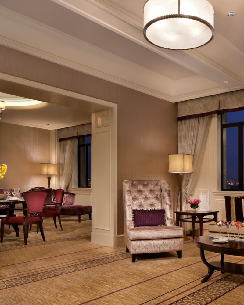 The luxuriously spacious Signature Riverview Suites is well-appointed with sitting room, dining room, bed room, walk-in closet, make-up room and washroom. Rich in design, horning the Art-Deco details and amenities, it pampers with spectacular views of the Huangpu River and Pudong skyline.