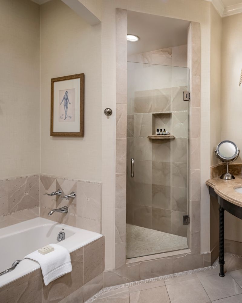 Offenes Layout mit Kingsize-Bett, Whirlpool-Wanne, Kamin und Schlafsofa. Entspricht vollständig dem Americans with Disabilities Act (ADA) und verfügt über eine rollstuhlgerechte Dusche, Haltegriffe an der Badewanne und an der Toilette, einen barrierefreien Waschtisch und/oder akustische/visuelle Signale.