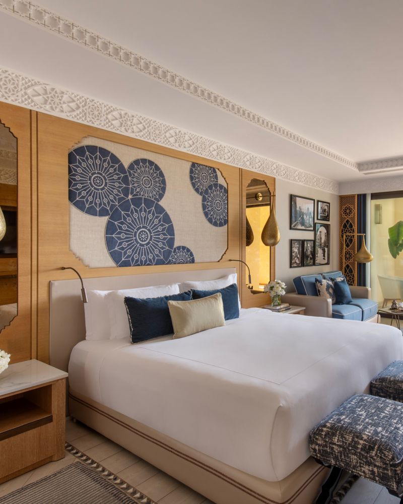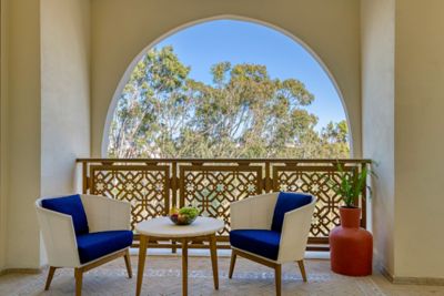 Suite mit 1 Schlafzimmer und fantastischem Panorama mit festgelegtem Schlaf- und Wohnbereich, mit modernem Design mit traditionellen marokkanischen Einflüssen und den Farben des Mittelmeers, Luxusmarmorbad und großem eigenem Balkon.