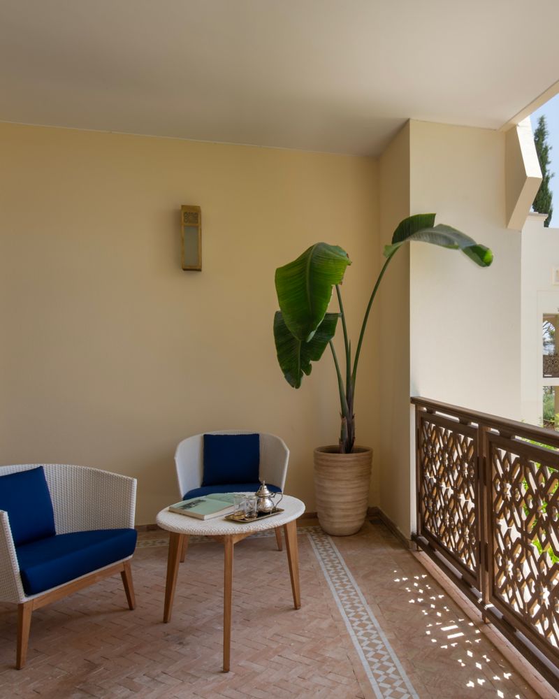 Das Zimmer bietet eine erfrischende eigene 11 m² große Gartenterrasse, ein fantastisches Schlafzimmer mit integrierter Lounge und ein Luxusmarmorbad. Das vielfältige Zimmer-Design verbindet traditionelle marokkanische Einrichtung mit mediterranen Farben.