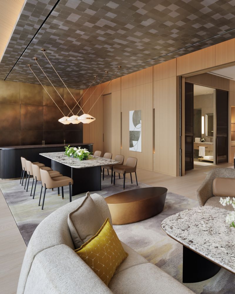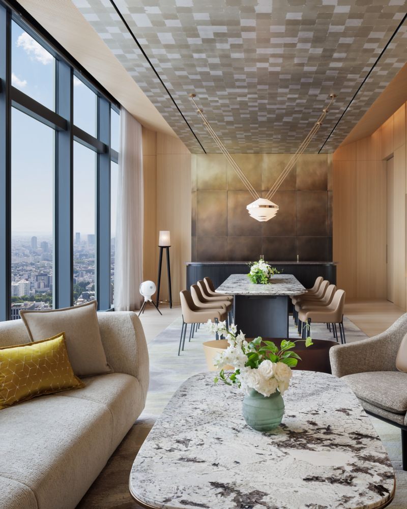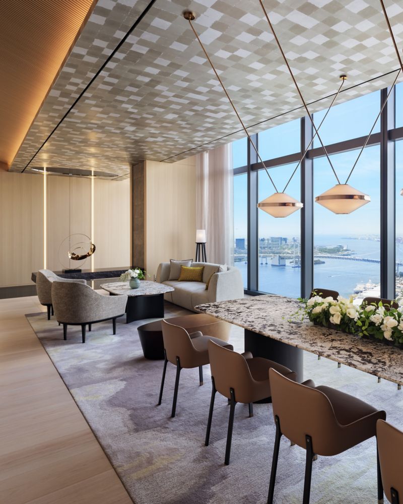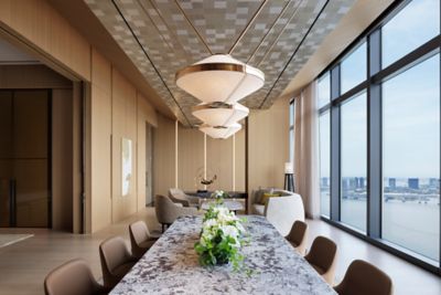 Enjoy the spacious 152 sqm View Suite with dual views of the city skyline and Tokyo Bay. Featuring separate living, dining, and work areas, this suite blends traditional craftsmanship with modern Japanese design, exuding artistic elegance. Tailored high-end amenities ensure comfort, while access to the Fairmont Gold Lounge offers unmatched luxury.