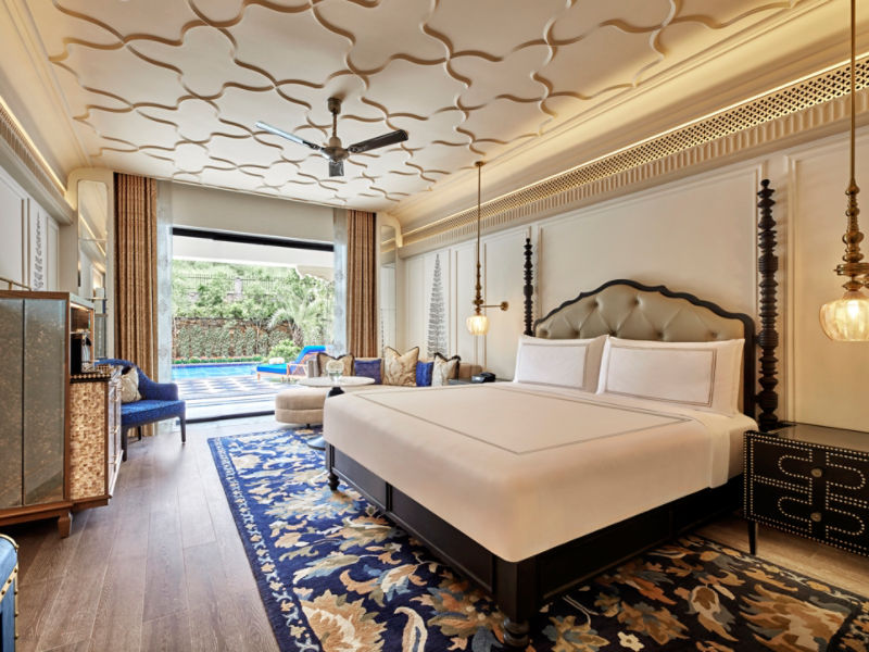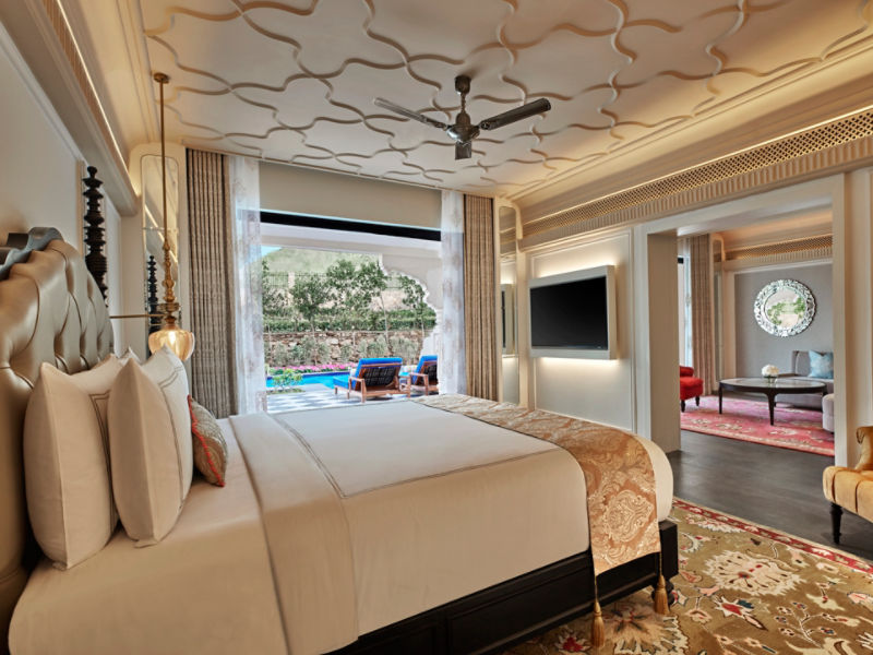 Die Rajputana-Suite mit gehobener Innenausstattung und majestätischem privaten Kuppelbereich zur Entspannung der Sinne bietet unvergleichlichen Luxus. Gäste können in der angeschlossenen Lounge auf der Terrasse relaxen und die surreale Umgebung genießen.