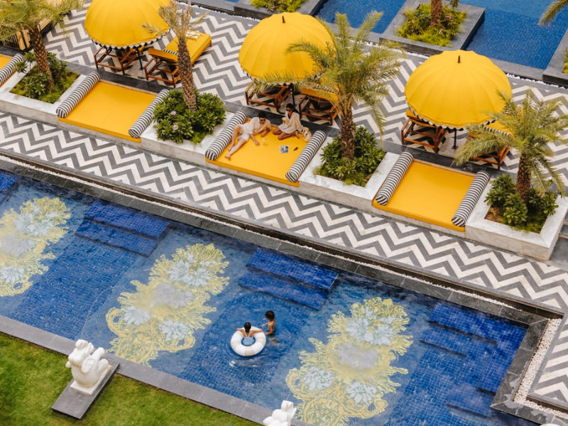 Erleben Sie unvergleichlichen Luxus in unserem großzügigen Zimmer mit privater Cabana, halbprivatem Infinity-Tauchbecken und Blick auf die Berge. Faszinierende Farben und eine individuelle Einrichtung sorgen für eine luxuriöse Ruheoase.