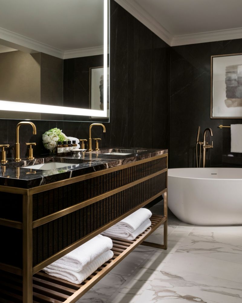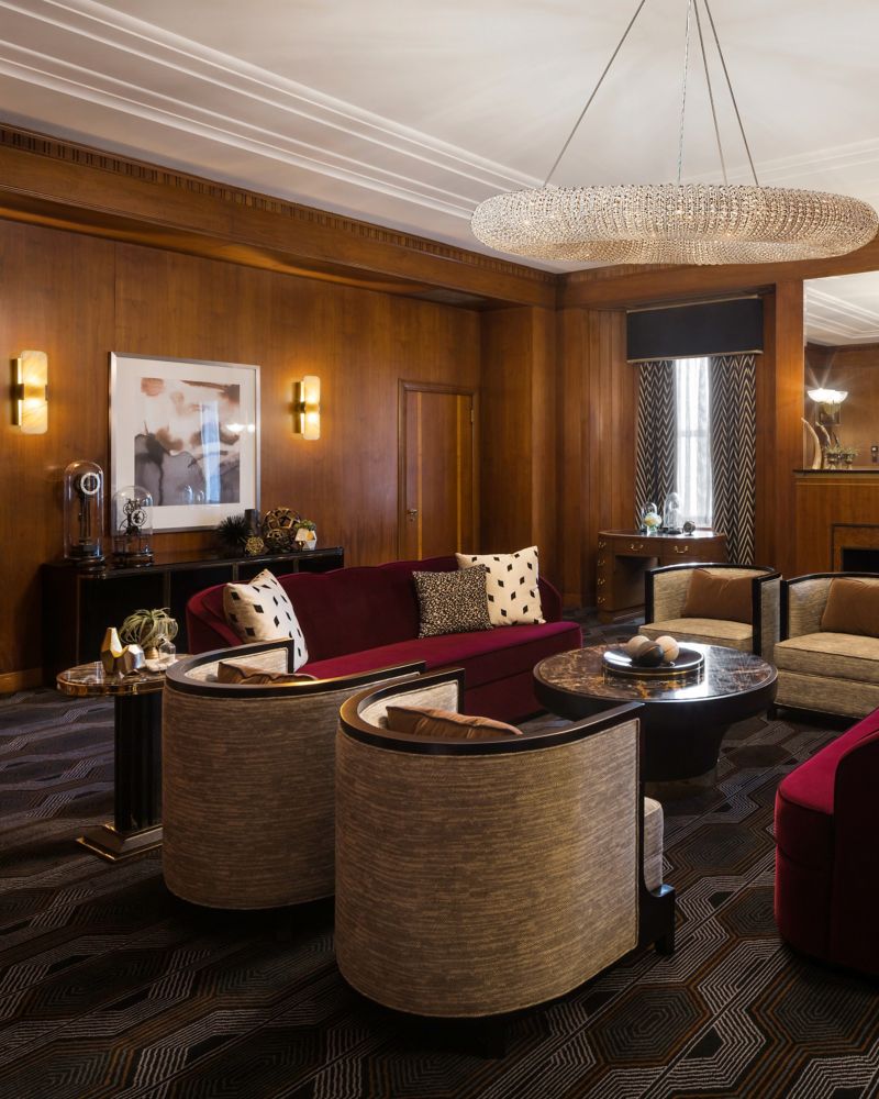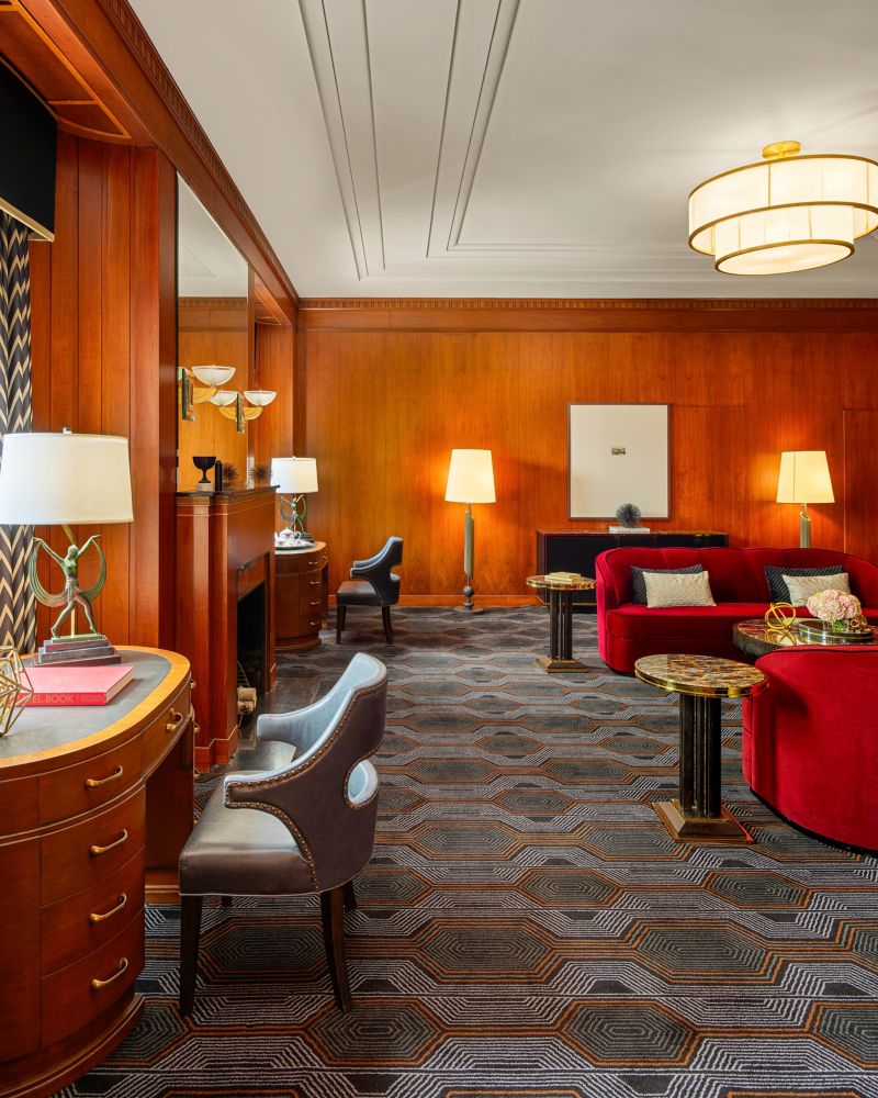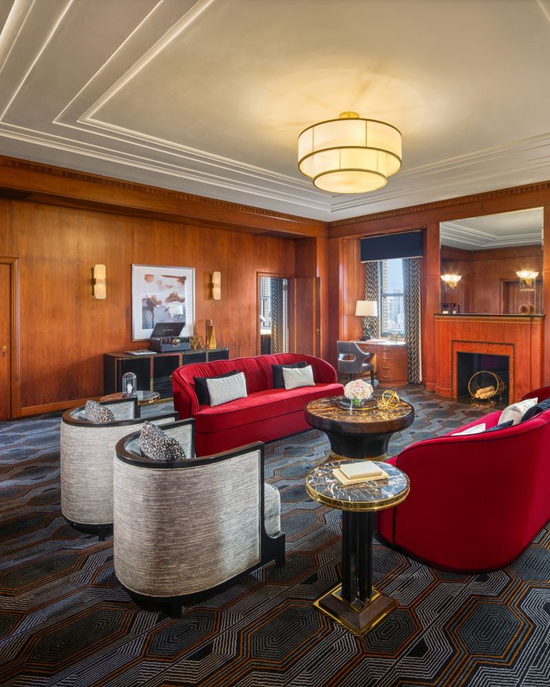 The glamorous Lieutenant Governor’s Suite design is unmistakable in its Art Deco influences. Parlour features original English black walnut veneer-paneled walls and a sitting area up to 20 people. Master bedroom with polished brass, black lacquer, and plush velvet finishing, includes a sitting area, and a spacious marble spa bathroom.