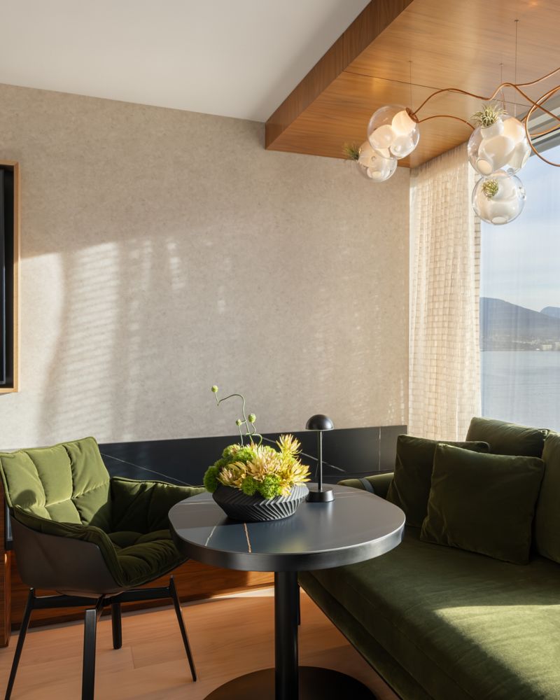 Die Signature Harbour View Suite bietet den schönsten Hafen- und Bergblick von Vancouver. Elemente aus Mode, Kunst und Musik im Wohnzimmer, zwei Marmor-Bäder, Schlafzimmer mit einem Kingsize-Himmelbett und einem großen begehbaren Schrank.