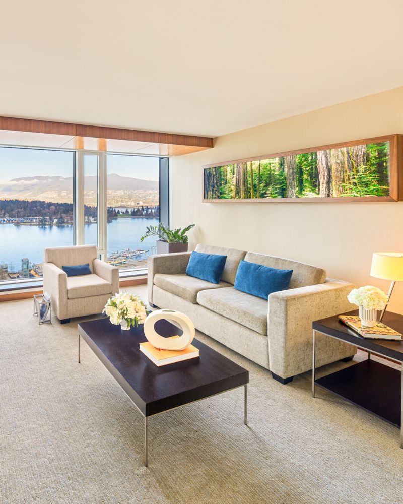 Die Signature Harbour View Suite bietet den schönsten Hafen- und Bergblick von Vancouver. Elemente aus Mode, Kunst und Musik im Wohnzimmer, zwei Marmor-Bäder, Schlafzimmer mit einem Kingsize-Himmelbett und einem großen begehbaren Schrank.