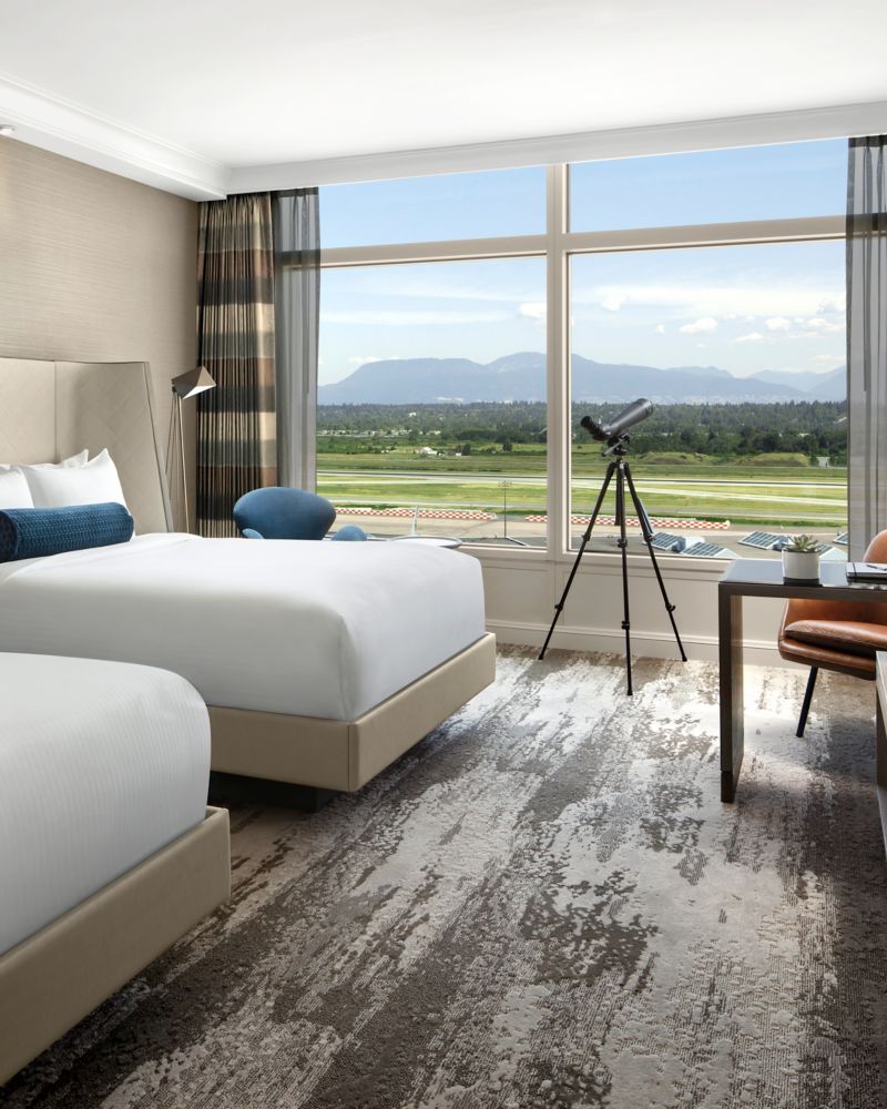 Every stay at Fairmont Vancouver Airport offers a perspective that’s both serene and spectacular. North-facing rooms frame the majestic North Shore Mountains and active runways, creating a rare combination of quiet retreat and captivating motion. South-facing rooms reveal runway activity and, from higher floors on sunny days, golden sunsets or glimpses of the distant Gulf Islands.