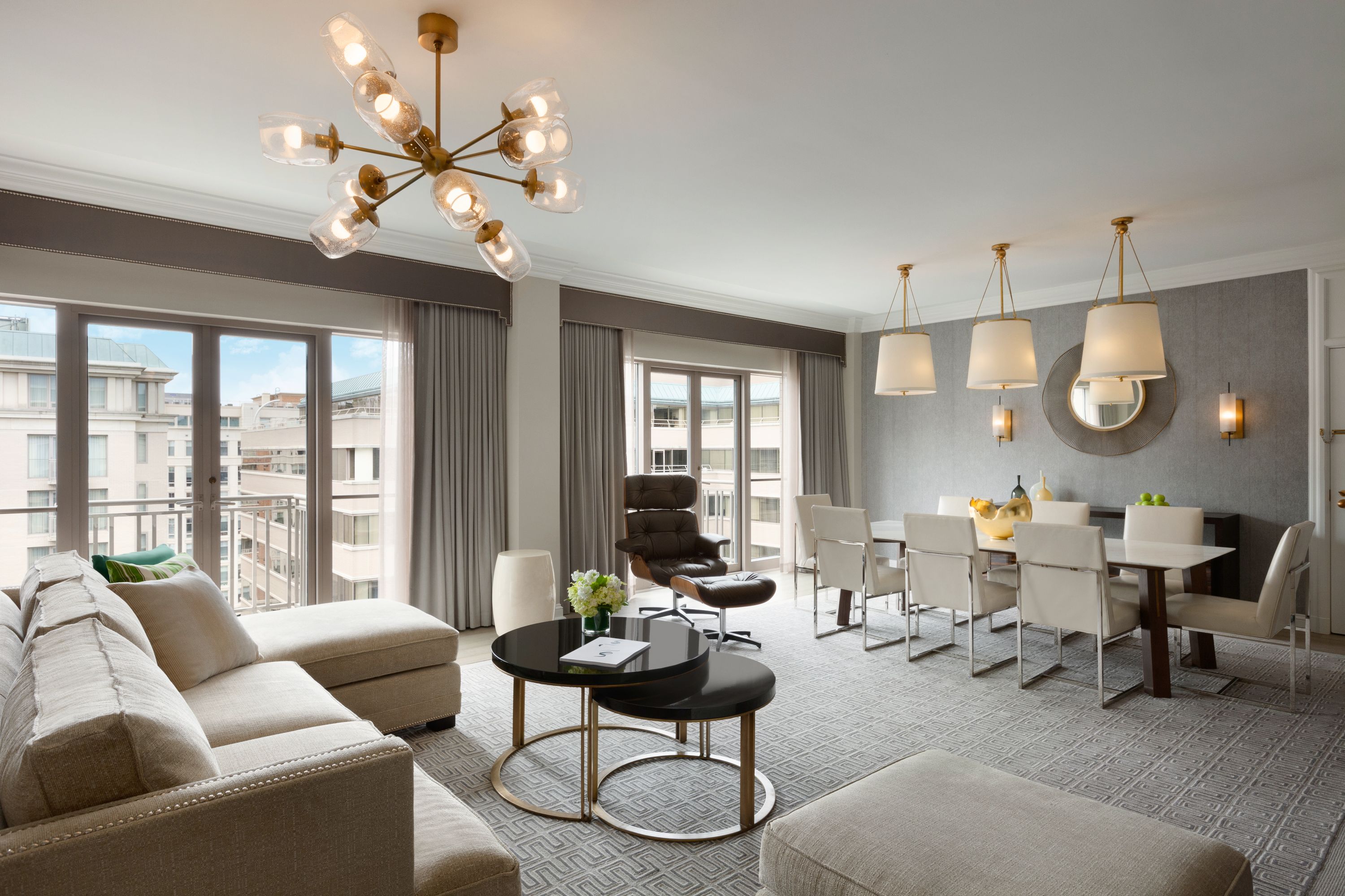 Diese beeindruckende Suite, die Washington zur goldenen Stunde einfängt, wurde speziell für Empfänge und den Empfang von Gästen entworfen. Separater Wohnbereich und private Balkone mit Hofblick bieten Platz und Diskretion, mit Fairmont Gold-Privilegien.