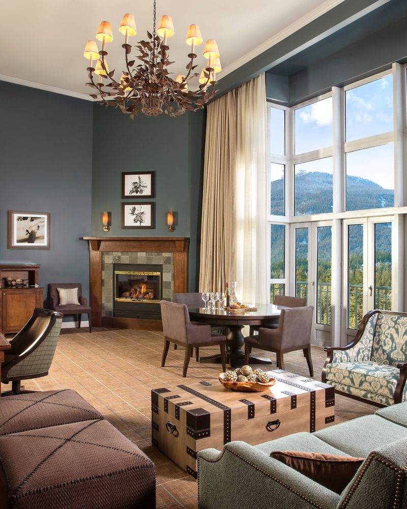 Geräumige Eck-Suite mit der beliebtesten Aussicht auf die Whistler Mountains und die Hänge des Blackcomb Mountain hat einen großen Wohnbereich mit Doppel-Sofabett und Kamin, 2 Badezimmer, Jacuzzi, 2 TVs, eine voll ausgestatteten Arbeitsplatz, HS-Internet