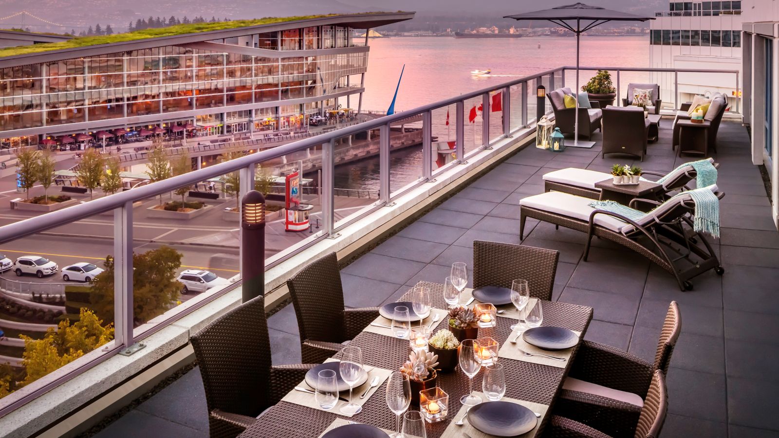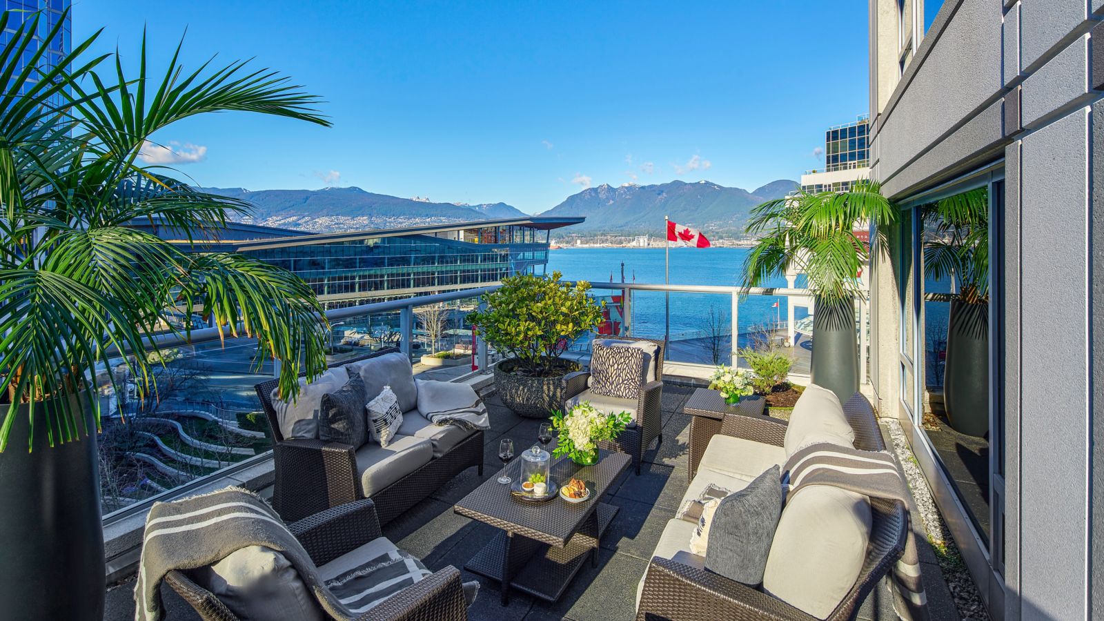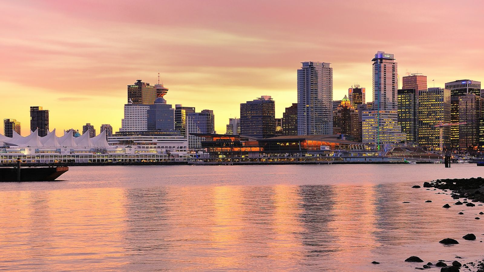 Vancouver unfolds between the ocean and the mountains, with gleaming towers catching the light along the harbor and forested peaks shaping the horizon. Coal Harbour lines the northern edge of downtown, False Creek wraps around the south, and the North Shore Mountains create a striking backdrop from almost every corner of the city.
