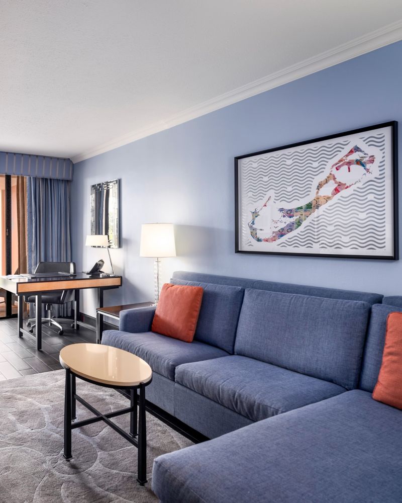 Located in the Poinciana Wing by the Infinity pool. Modern suites with private terrace, separate living area and oversized baths with shower and tub.