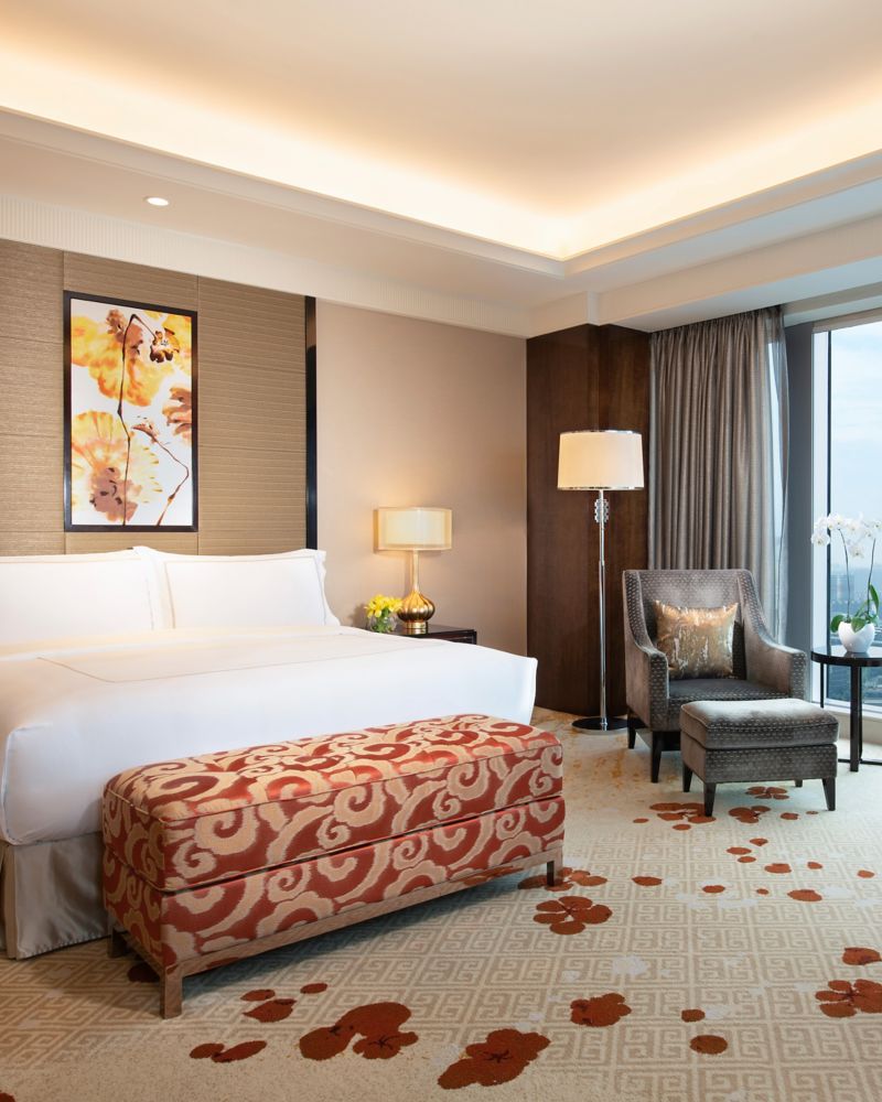 Room with a king bed. Located on 6th to 27th floors and boasting an expansive space of 45-50m², the room showcases an amazing city view of Hi-tech Zone adjacent to the large Convention & Exhibition Centre, bustling shopping malls and commercial district.