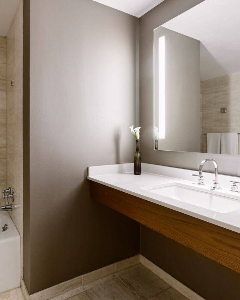 Stand alone shower and bathtub with vanity area for comfort. Spacious guestrooms include sitting area with work space.