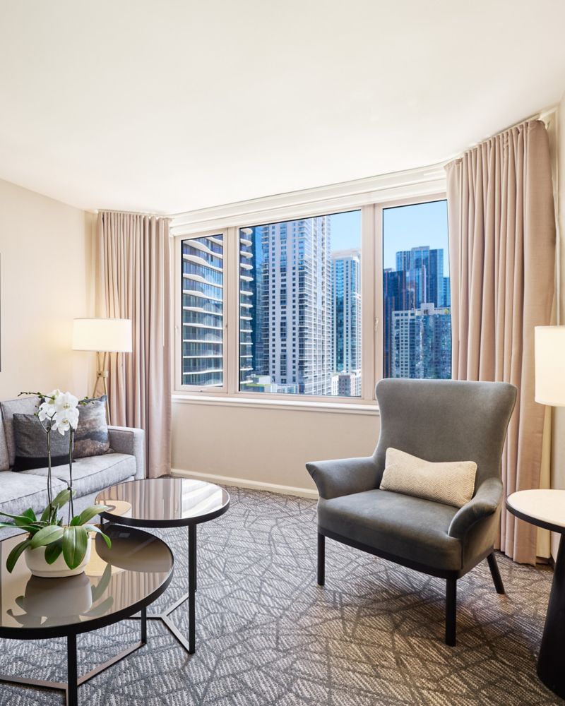 Suite with separate living room and bedroom. Magnificent views of Millennium Park and Lake Michigan. Stand alone shower, bathtub with vanity area for comfort. Spacious rooms include sitting area, work space.