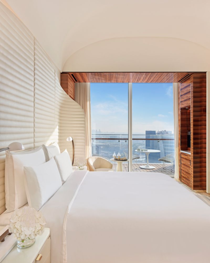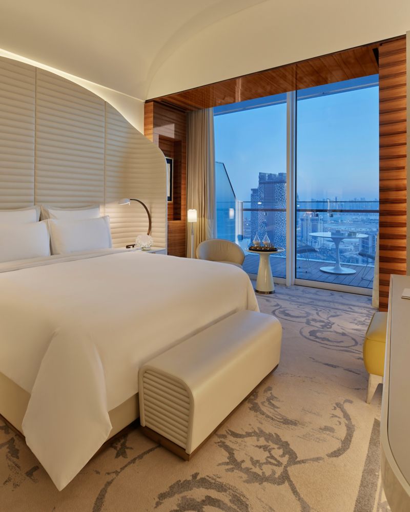 The Premier King Sea View Balcony showcases stunning Arabian Gulf panoramas through floor-to-ceiling windows and a generously sized private balcony, seamlessly blends elegant interiors with refined service for a truly exceptional experience.