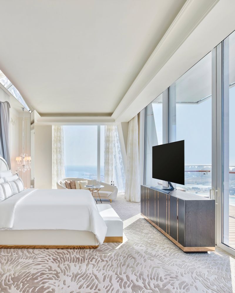The Premier King Sea View Balcony showcases stunning Arabian Gulf panoramas through floor-to-ceiling windows and a generously sized private balcony, seamlessly blends elegant interiors with refined service for a truly exceptional experience.