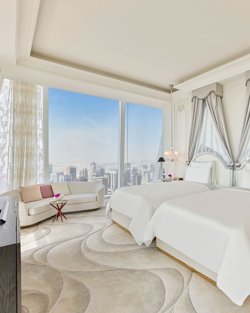 Enjoy Arabian Gulf views from your Fairmont Twin Sea View Room, a serene retreat for relaxation or work. Featuring twin beds, and sleek white-leather headboards, includes a gold-tiled walk-in shower, a tub, and elegant amenities for a refined stay.