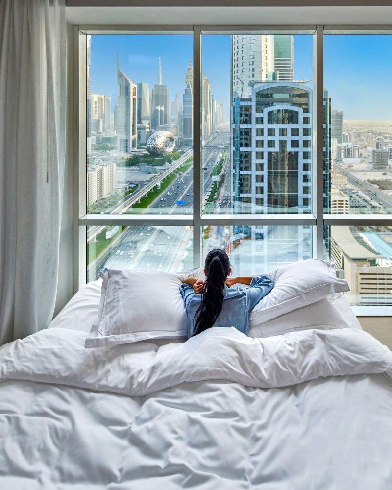 Soaring views of the Dubai skyline and Museum of the Future through floor-to-ceiling windows set the tone for a refined stay. Modern decor, seating area, and work desk make it perfect for solo travelers or couples.