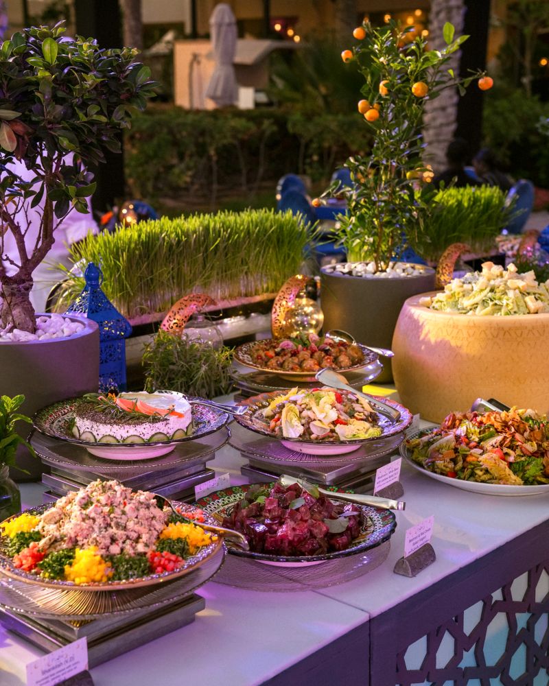 Savour a thoughtfully curated Iftar buffet, featuring an array of Middle Eastern classics and live cooking stations: hot mezzah like Kebbeh Batata, Meat Sambousek, and Crispy Falafel; live stations including Saj Manakish, Chicken Shawarma, Mixed Grills, and Lamb Ouzie; hearty dishes such as Lamb Harees, Moroccan Beef Couscous, Kousa Mahshi, and Chermula shrimps.