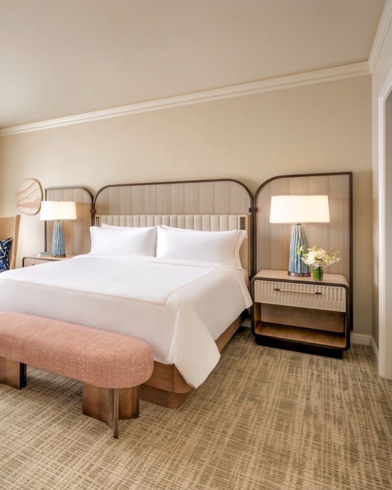 A spacious guest suite, residential in style, with views of the Pacific Ocean from a private patio. Offers a parlor area separated from the bedroom by French doors, wood and marble coffee console & writing desk. Includes Fairmont Gold services.
