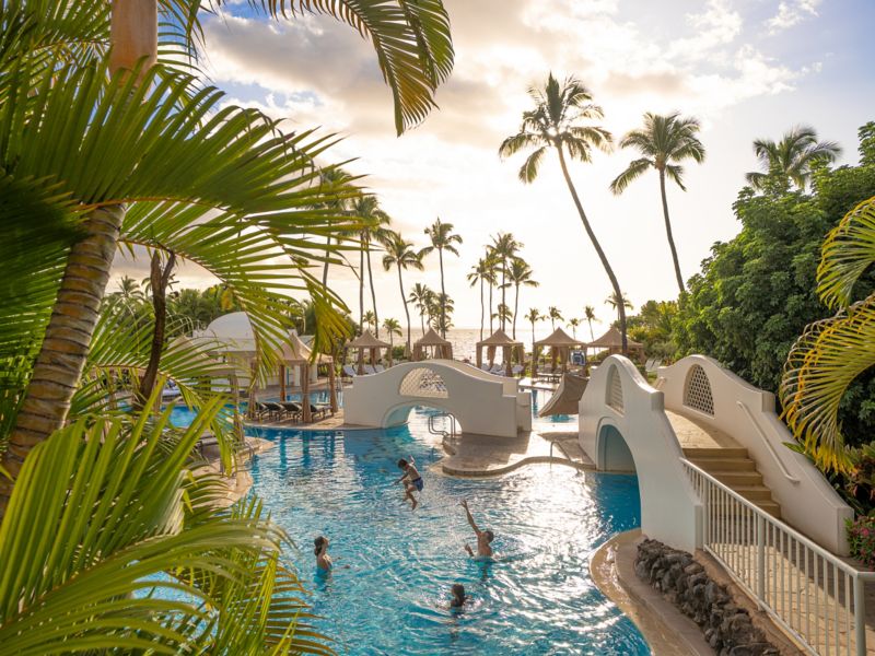 Fairmont Kea Lani has three crystal-clear resort pools including an adults-only tranquility pool and two family-friendly pools connected by a 140 foot water slide.