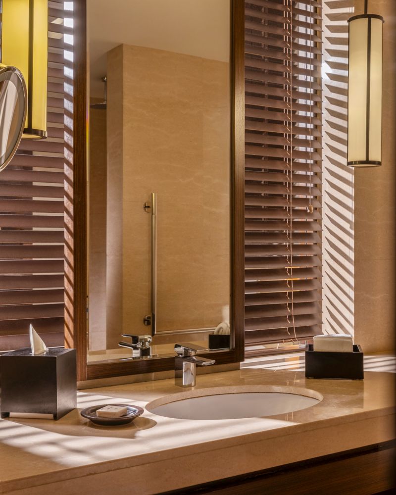 49 sqm room with twin bed, 49-inch LED TV, workspace with Wi-Fi, and a Japanese spa-inspired bathroom with rainforest shower. Enjoy designer coffee and tea selections, Le Labo amenities, and luxurious Fairmont comfort.